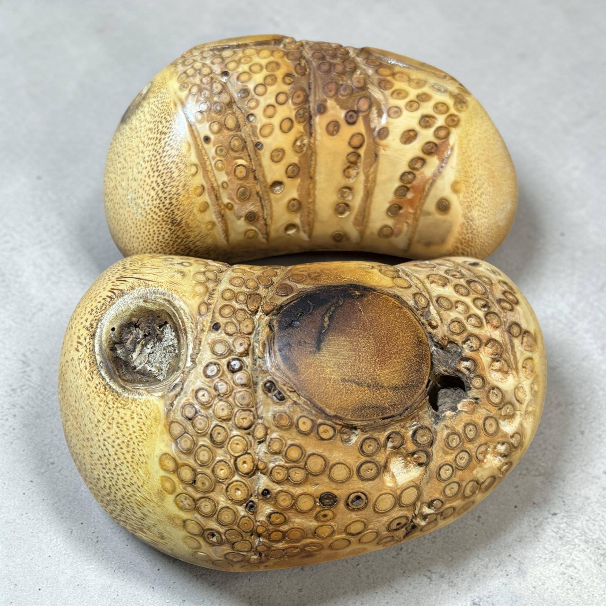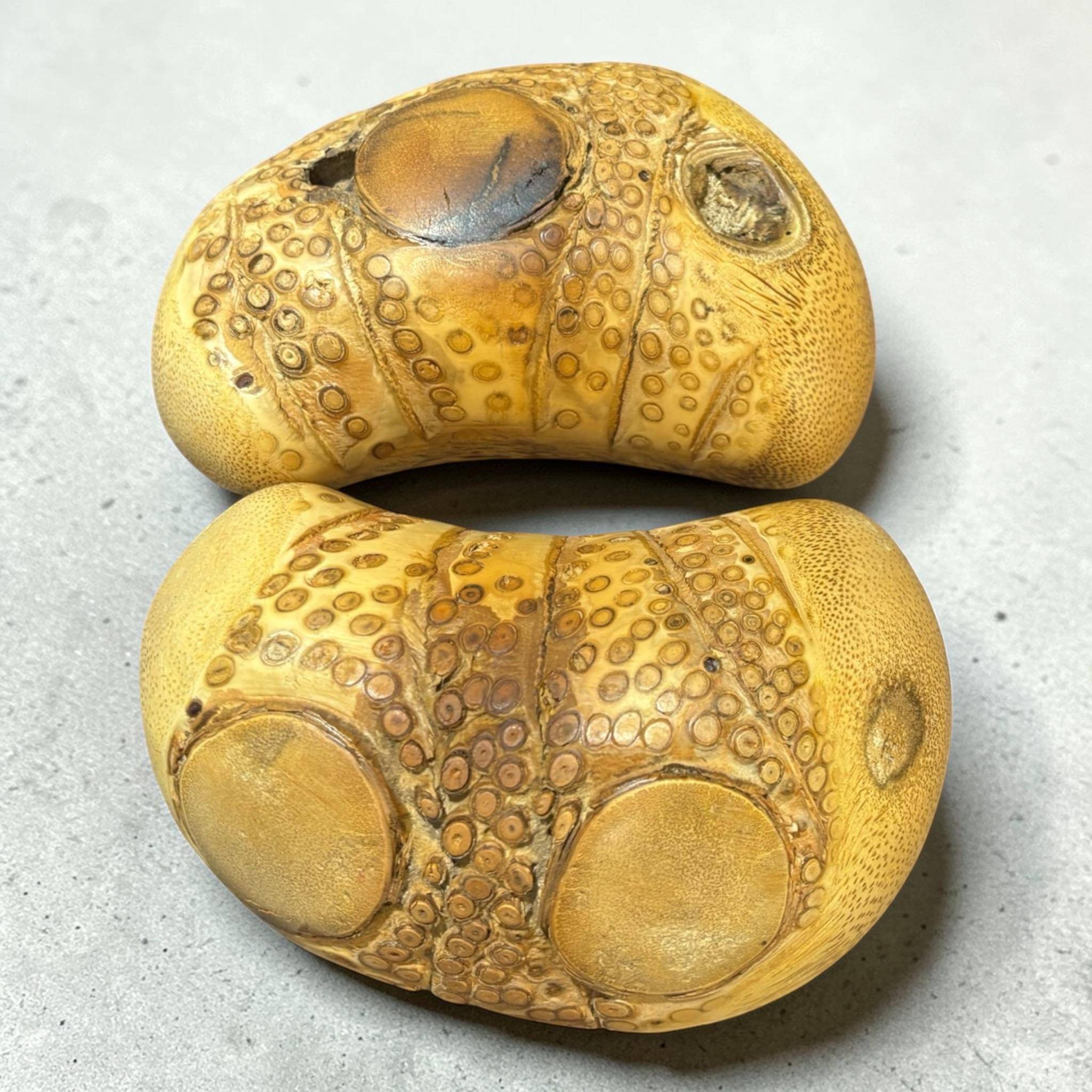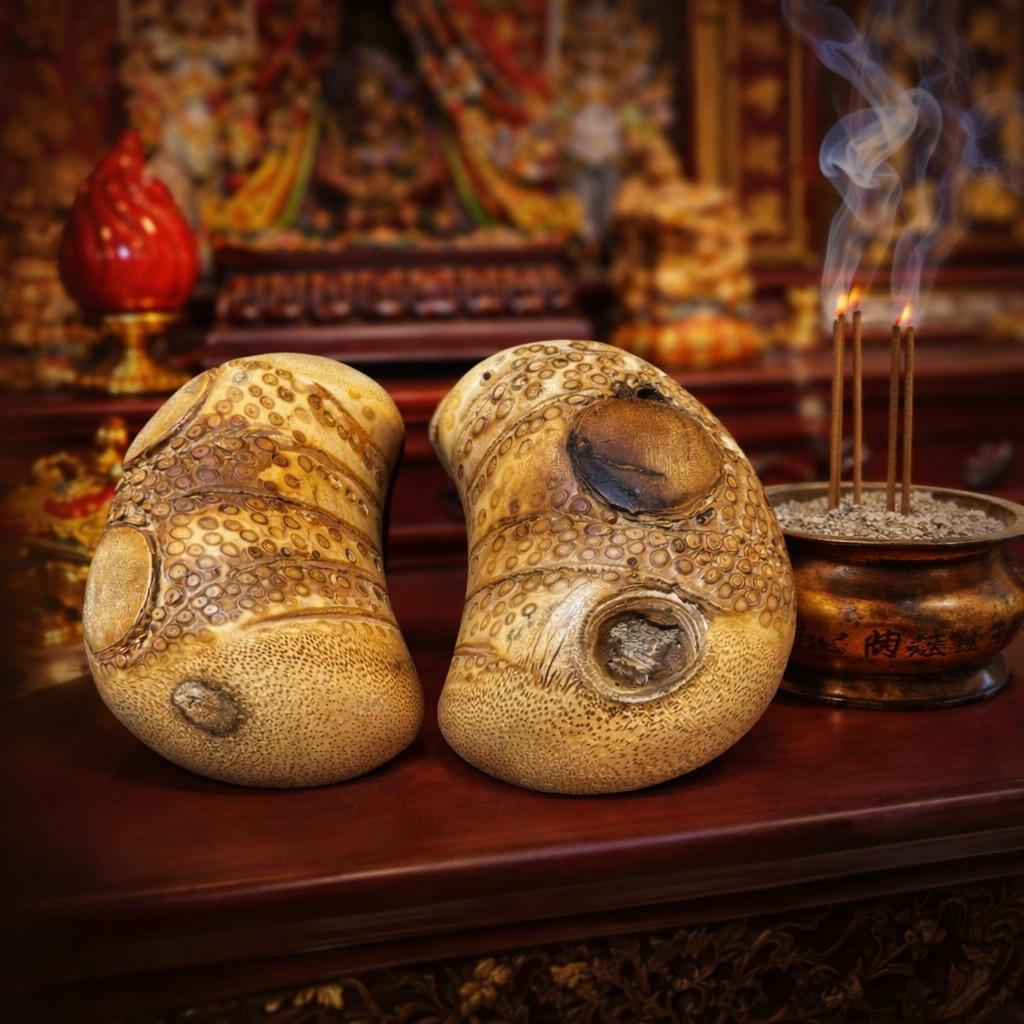竹頭杯是傳統民間信仰中一種高階、珍貴的占卜工具,選用生長在台灣刺竹的根部(竹頭)手工製作。因其自然纖維盤根錯節,具備「擲不壞」的堅韌彈性、清脆聲響,及其寓意特殊:竹頭連結樣貌寓意「百子千孫」,竹頭諧音「留德」的寓意。常被視為與神明溝通的最佳傳聲筒,常供奉於神桌前,是具備靈性與收藏價值的宗教藝術品。